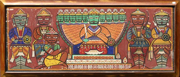ROY, Jamini (1887-1972): Royal Court with Armed Attendants, Gouache, 17'' x 43'', signed, Work Shop Gallery stencil verso, gold frame with wear, 20'' x 46''. Abrasions throughout with paint fleck.