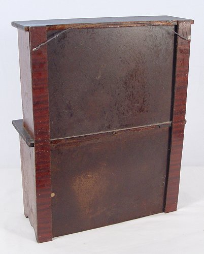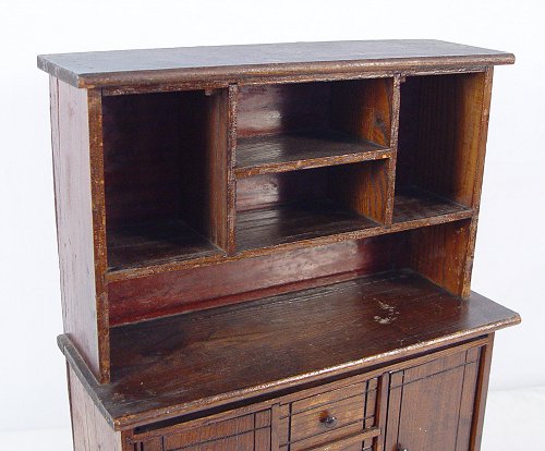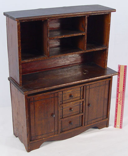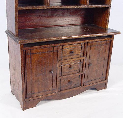 CHILD'S 2 DOOR 3 DRAWER CUPBOARD: Hand made dark stained wood child's size cupboard. One piece with open shelves over 2 door, 3 drawer base. Can be hung on wall. Measures 21 1/4'' high x 17'' wide x 7'' deep.