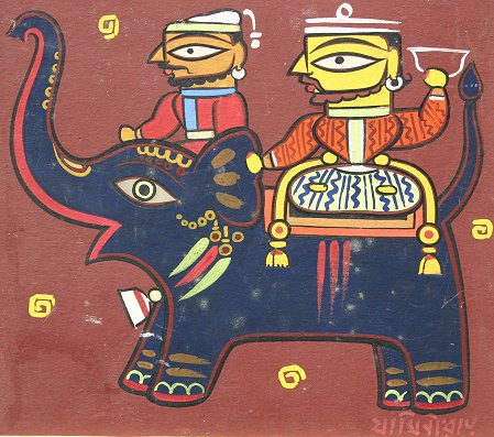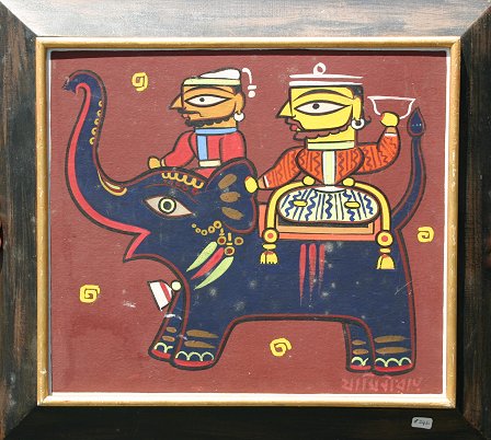 ROY, Jamini, (1887-1972): Elephant bearing a Prince and Mahout, Gouache, 13'' x 15'', signed, Work Shop Gallery stencil verso, framed, 17 1/2'' x 19''. Several minor scattered abrasions.