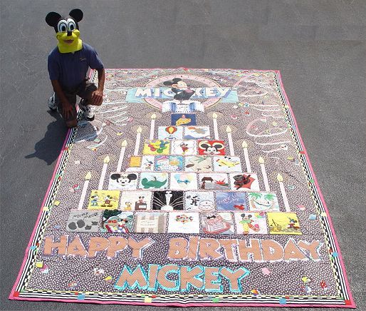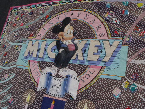 OVERSIZED MICKEY MOUSE HAPPY 60th BIRTHDAY PARTY QUILT: Applique quilt made by students and presented to be hung in Disneyland for the celebration of Mickey's birthday. Approx. 13'' x 8.5'. Metallic and cotton fabrics.