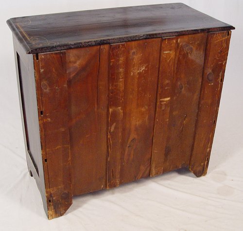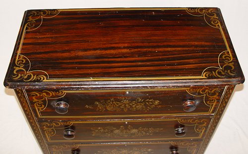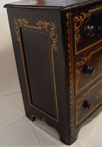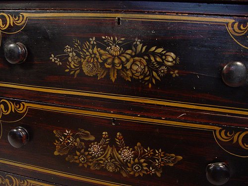 AMERICAN COUNTRY GRAIN PAINTED CHEST: Black and brown grain paint with hand painted gold scroll work. Panel back, dovetail construction. 32''h. x 35'' x 17''.