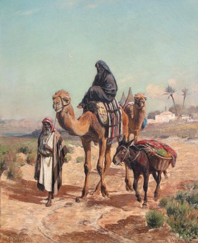 19TH C ORIENTALIST PAINTING OF TRAVELERS COMING FROM MARKET: Oil/Canvas, 28'' x 22'', signed twice Peters, dated 1888 & 1891, carved and gilded period frame, 38'' x 34''. Mild cracklure.