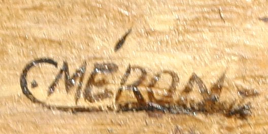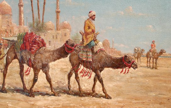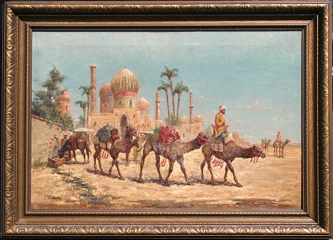 19TH C ORIENTALIST PAINTING OF CARAVAN LEAVING THE OASIS: Oil/Canvas, 20'' x 30'', signed C. Meron, encased in carved and gilded frame with wear, 26'' x 36''.