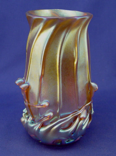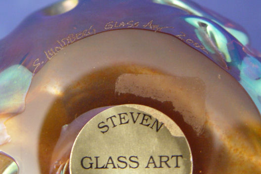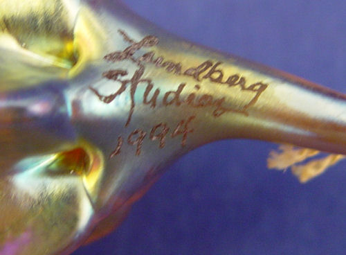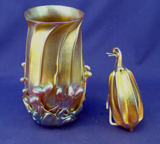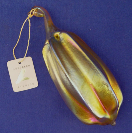 2 PIECE LUNDBERG STUDIOS IRIDESCENT ART GLASS: 1) Signed vase, 7''h. ''S. Lundberg Glass Art 2002''. 2) Squash ornament, 5 1/2'' long, signed ''Lindberg Studios 1994''.