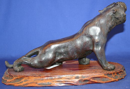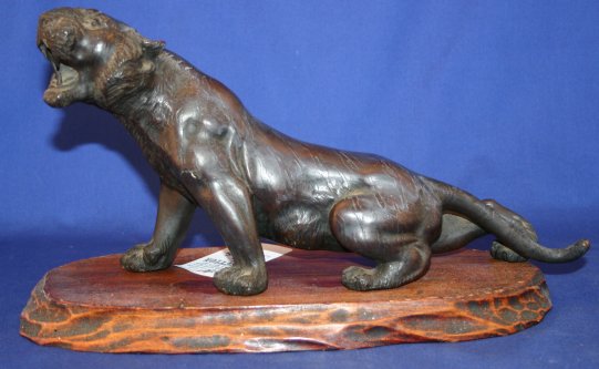 JAPANESE BRONZE TIGER: 6 1/4''h.. x 11''l, atop a carved wood plinth. Needs cleaning, house paint over spray speckles.