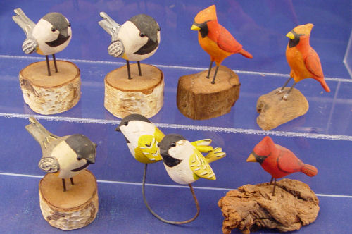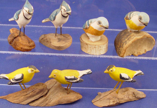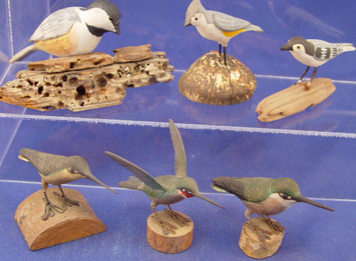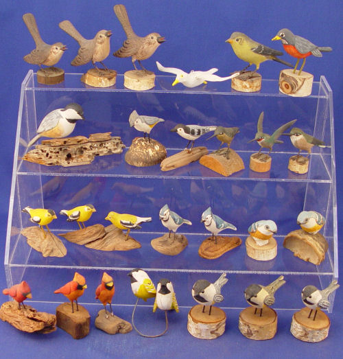 FRANK BROADBENT CARVED FOLK ART BIRD COLLECTION: 27 piece lot to include 2 blue jays, 3 cardinals, 3 hummingbirds, and other assorted birds. All are handcarved and handpainted by artist. Most are on pieces of wood bases and signed FSB, dates ranging from the 1950's to 1970's. Please note repair on seagull. 3 birds have no bases.