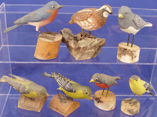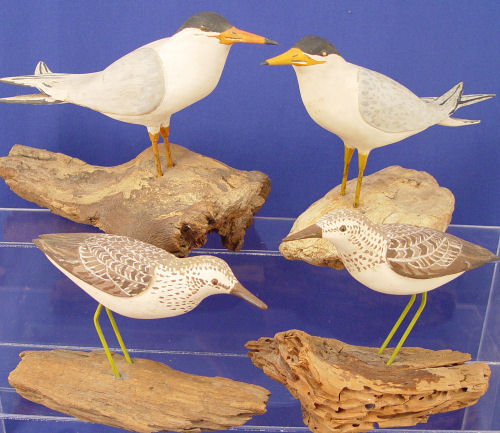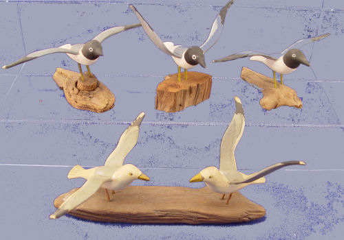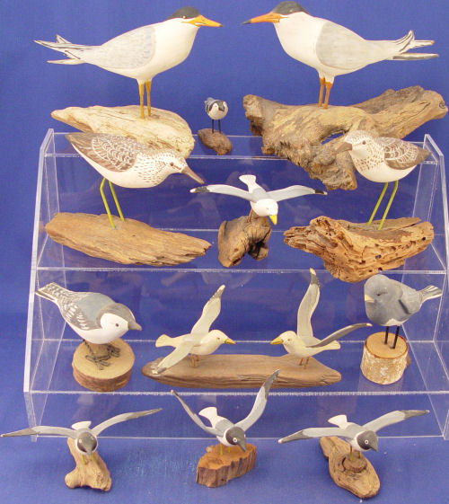 FRANK BROADBENT CARVED SEA BIRDS FOLK ART COLLECTION: 12 pieces to include 6 seagulls, 2 sandpipers and assorted shore birds. All hand carved and handpainted by artist. All have wood bases and signed FSB on base with dates from 1940's to 1970's. Size ranges from 6 1/2'' to 2'' high.