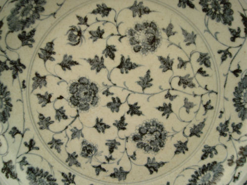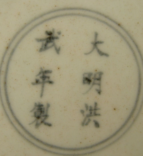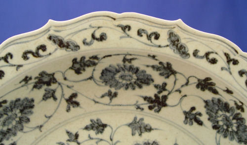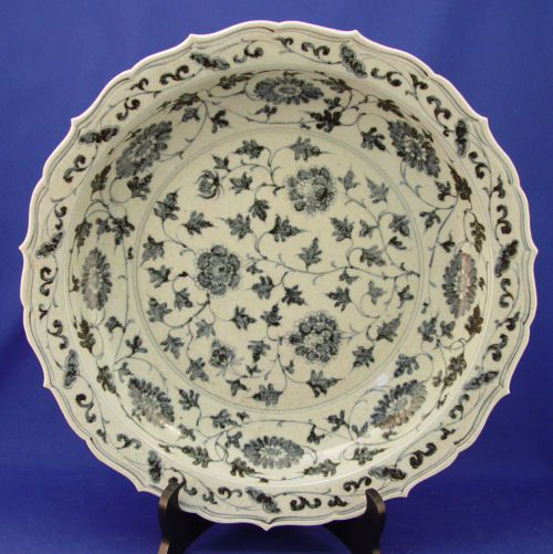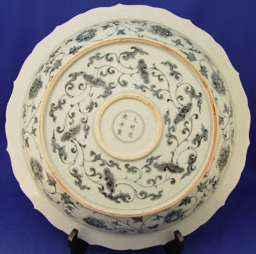 CHINESE BLUE & WHITE SHALLOW BOWL: Scalloped edges, signed in characters on the underside, 3'' high x 16 1/4'' dia.