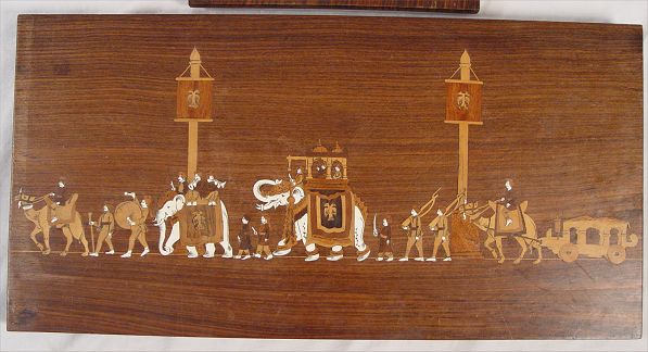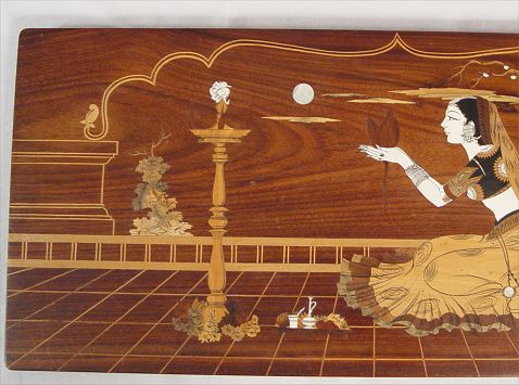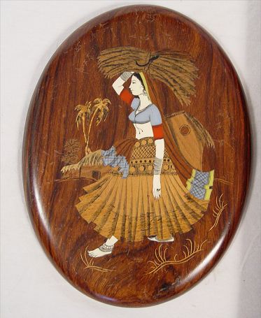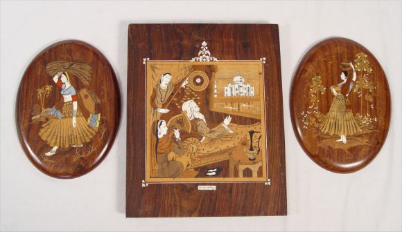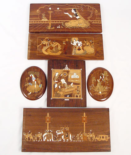 6 INDIAN IVORY INLAID FIGURALLY DECORATED ROSEWOOD WALL PLAQUES: Late 19th and 20th century. 1) the Taj Mahal '' a dream built''. 2) a procession. 3) beautiful girl praying. 4) group of 3 with dancers. Various heights and shapes ranging from 12'' to 26'', all with hanging attachments.