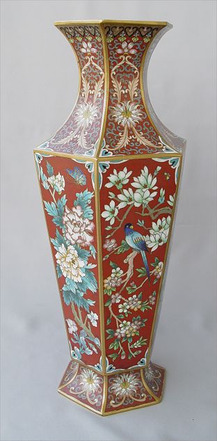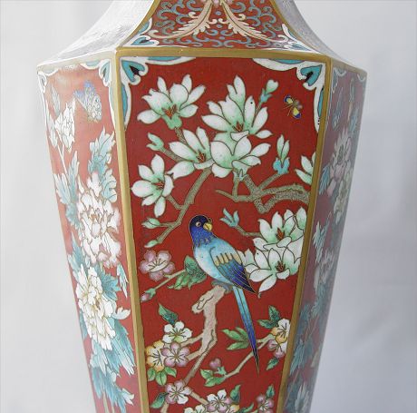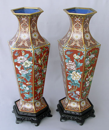 PAIR CHINESE CLOISONNE VASES: 15 1/4'' tall vases. Six panels, each with flowers, alternating panels with birds. Sold with the carved wood bases.