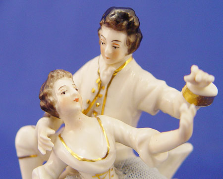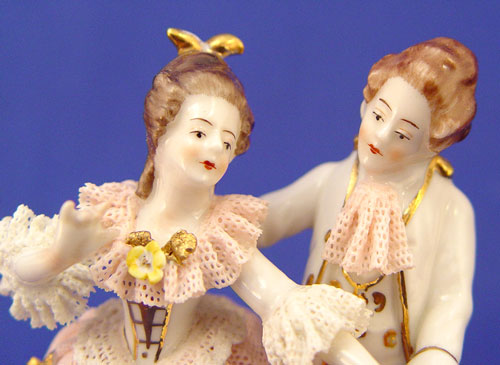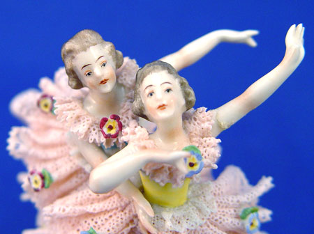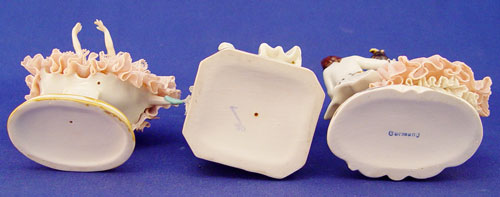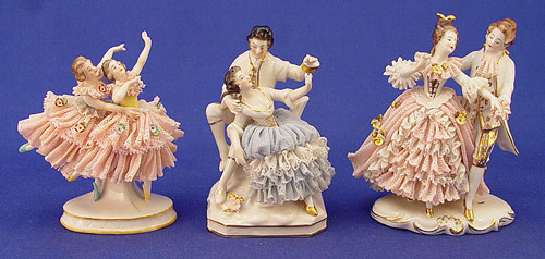 3 MINIATURE GERMAN PORCELAIN LACY FIGURINES: 1) Two ballerinas in tired lacy gowns, 4''h. 2) Courting couple, her in a blue dress, 4 1/2''h. 3) Dancing couple in pink, 4 1/2''h. All three bear the crown F mark of exporter Franz Witter.