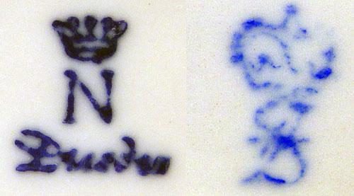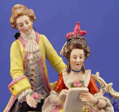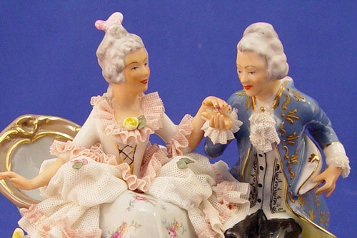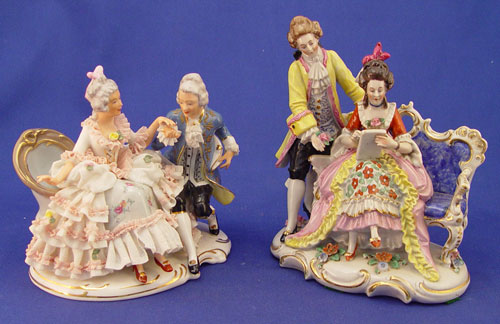 DRESDEN AND SITZENDORF PORCELAIN FIGURINES: 1) Dresden crown N mark, lacy courting couple, 6'' x 6 1/2''. 2) Sitzendorf courting couple, the man with a rose in his hand, 7 1/4'' x 6''.