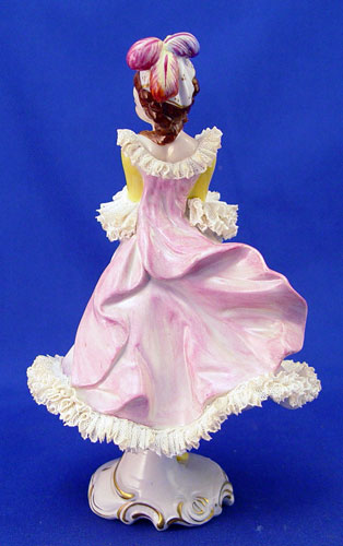 FINE VOLKSTEDT GERMAN PORCELAIN FIGURINES, MAN AND WOMAN: Dressed in lace adorned finery, her with a fan, him with a walking stick. Each with the Volkstedt mark. 8'' tall.