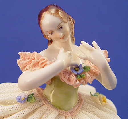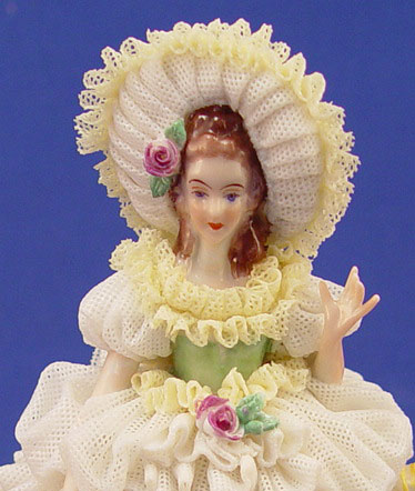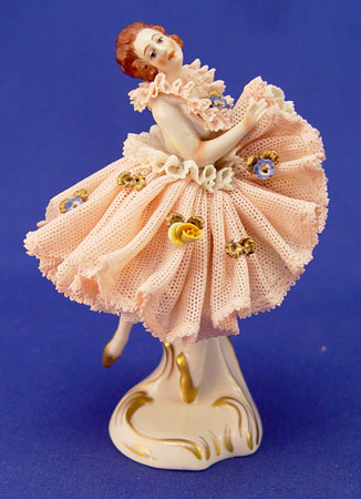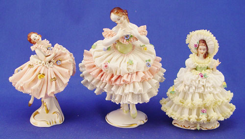 3 DRESDEN TYPE GERMAN PORCELAIN LACY FIGURES: 1)Volkstedt ballerina in a four tier lacy dress, 6''h. 2) Green crown mark, yellow trim lacy dress with large hat, 5'' tall. 3) Furstenberg pink ballerina, 5''h.