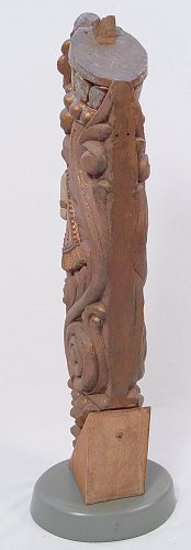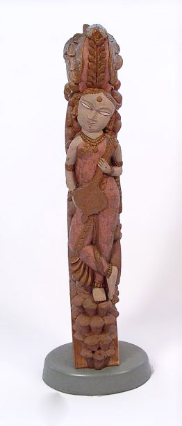 19th C CARVED INDIAN FIGURAL WOOD TEMPLE POST: Girl with sitar, polychrome, 29''h.