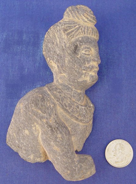 SMALL GANDHARAN GREY SCHIST FRAGMENT OF MAITREYA: Northwest Pakistan 3rd / 5th century. The face with a wavering mustached, his hair arranged in rolls caught into a top knot. Partial right arm, left arm missing. 5 1/2'' high.