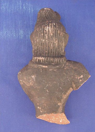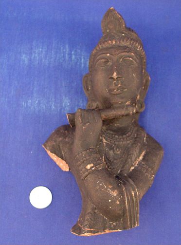 SOUTH INDIAN SANDSTONE ARCHITECTURAL FRAGMENT OF KRISHNA: Circa 15th century. Conical hairstyle that cascades behind to shoulders, wearing jewel and carrying a broken flute. 9'' high.