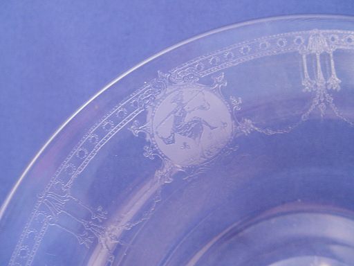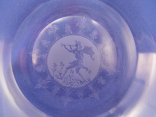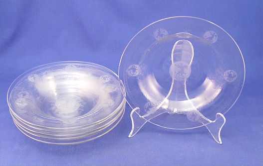 HEISEY ETCHED GLASS SOUP BOWLS IN THE ''PIED PIPER'' PATTERN: Crystal color, 8 1/2'' dia.