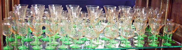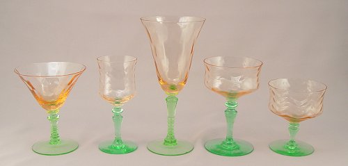 42 PIECE VASELINE AND PINK DEPRESSION ERA GLASSWARE: To include 9 goblets (7 3/4''), 11 tall wines (5 1/2''), 7 champagne, 11 wine stems, 4 low sherbert. Please note chips.