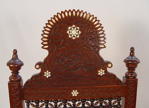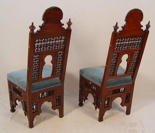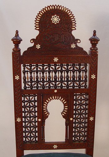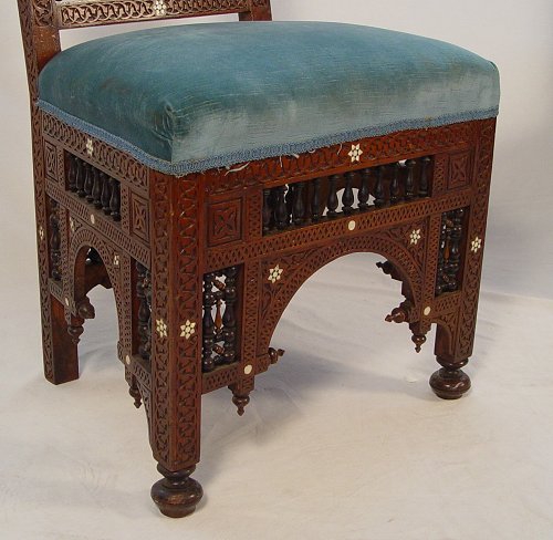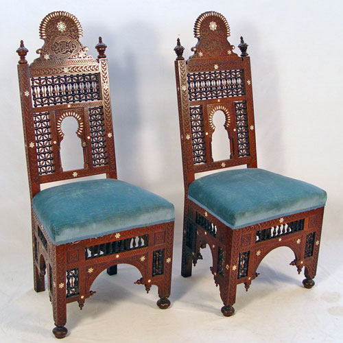 PAIR OF CARVED AND MUSHRABIA DECORATED DAMASCENE SIDE CHAIRS: 19th century. Each with an arch cresting rail carved with Kufic script above a mushrabia backrest centering a open mihrab. Flared rectangular seat upholstered in pale turquoise velvet and a mushrabia and mirhab skirt above carved straight legs. the whole decorated with scattering of mother of pearl flowerhead motifs. 48'' high x 20'' wide