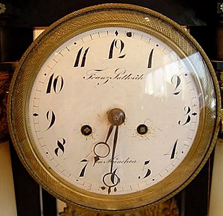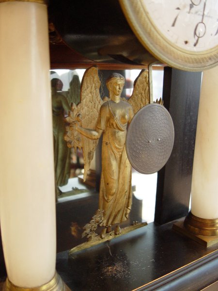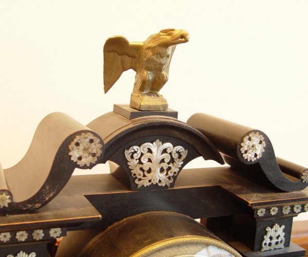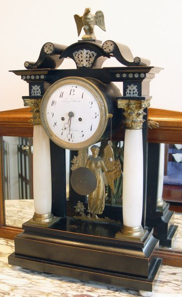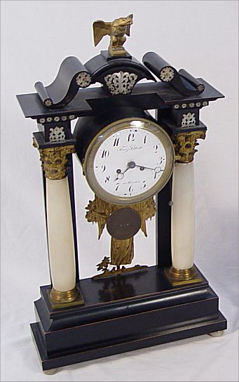 FRANZ PATHSCH GERMAN PORTICO CLOCK: Ebony base and scroll design mantle with 2 alabaster columns. Carved painted wood eagle finial. Mother of pearl decoration on mantle. Pressed metal angel with flowers in between mantle and base behind pendulum. 6'' porcelain face with Arabic numerals. Makers name ''Franz Pathsch en Munchen'' on face. Key and pendulum works. Please note small crack on face of clock and break of metal on angel at feet. Measures 24 3/4'' high x 14 1/4'' wide x 5 1/8'' deep