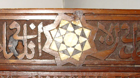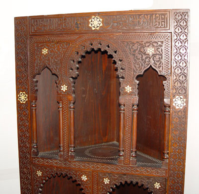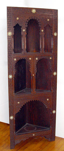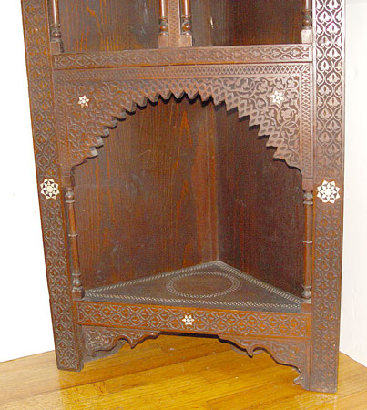 EGYPTIAN MOTHER OF PEARL INLAY CARVED HARDWOOD CORNER CUPBOARD: 19th Century. Six mihrab arches frame three open shelves. Carved with Kufic script across it's upper edge and overall with scrolling floral and foliate designs and inlaid with mother of pearl flowerheads. 64'' high x 24'' wide x 11 1/2'' deep.