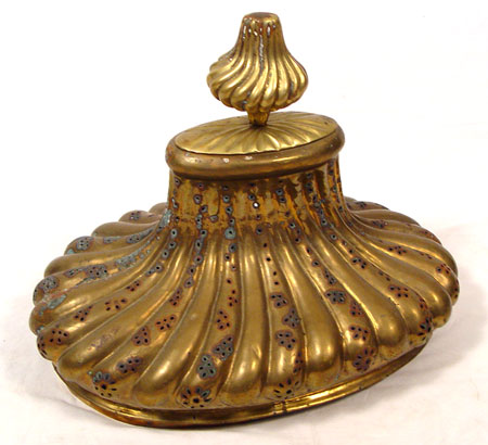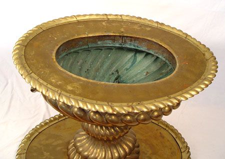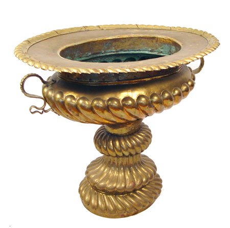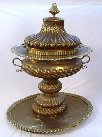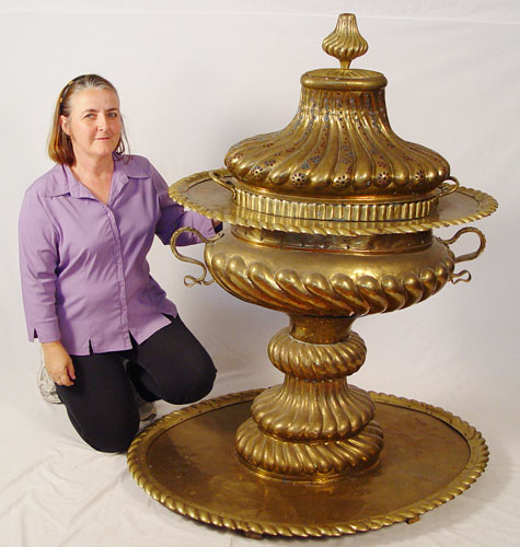 MONUMENTAL TURKISH BRASS BRAZIER STAND AND TRAY: Late 18th Century. Reputedly from the Said Halim Pash Bospherus Summer palace. Pedestaled bulbous body and domed cover lifting to reveal a circular well with lobed paneled decoration overall and rope borders. 52''h, 33'' dia.