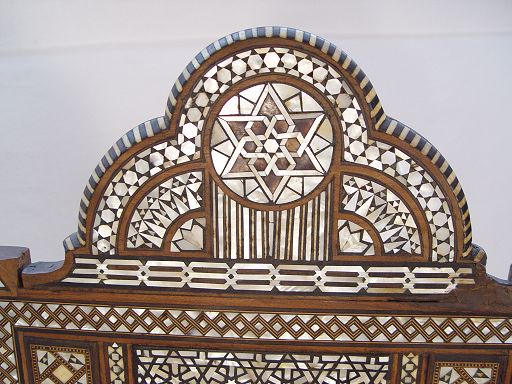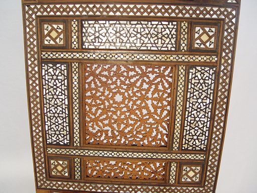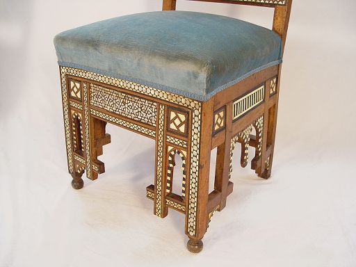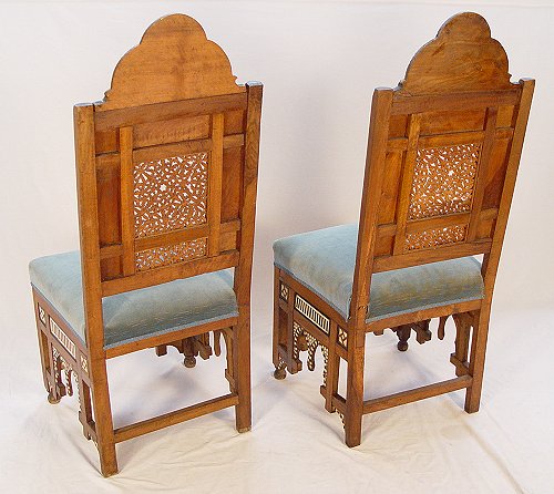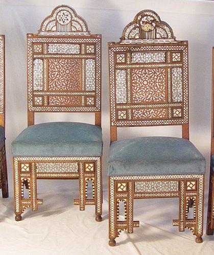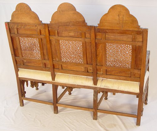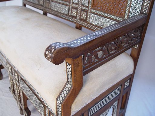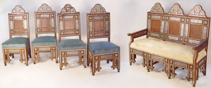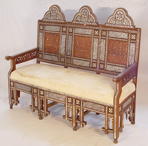5 PIECE SYRIAN MOTHER OF PEARL AND BONE INLAID HARDWOOD PARLOR SUITE: Early 20th Century. Triple back settee and four side chairs. All with arched crestings above rectangular back rests centering fretwork wood panels within mother of pearl inlaid borders. All with square seats, sofa seat upholstered pale yellow velvet, chairs in turquoise velvet all above conforming apron panels. Flat open mihrab decorated legs and round peg feet. Settee measures 49'' high x 58'' wide.