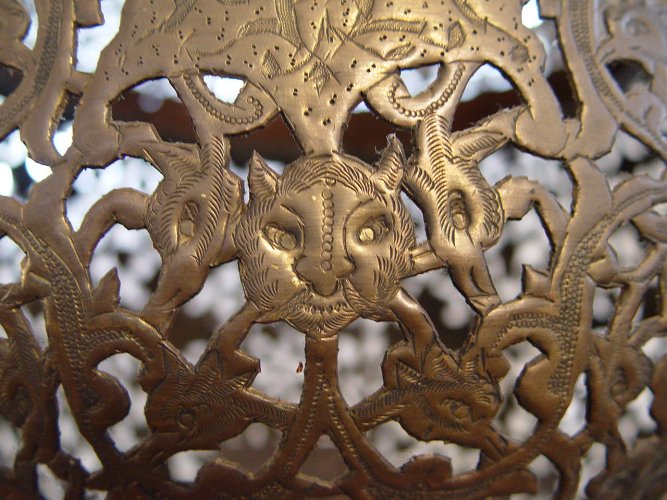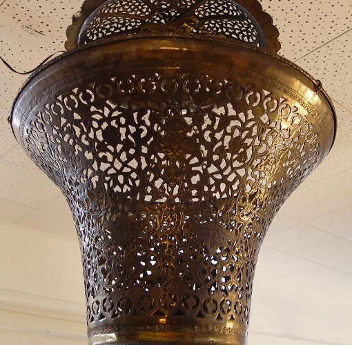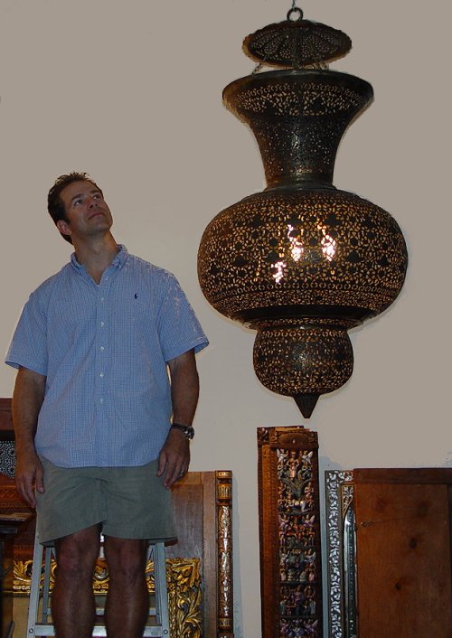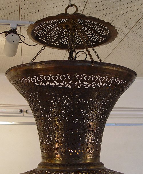 4.5 FT TALL INDIAN PIERCED BRASS HANGING MOSQUE CHANDELIER: Electrified, approx. 54''h. x 29''dia.