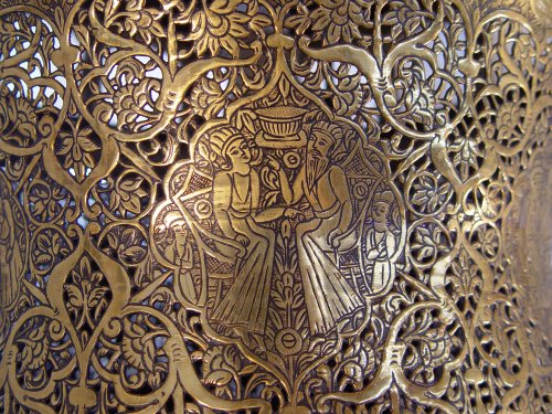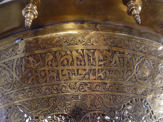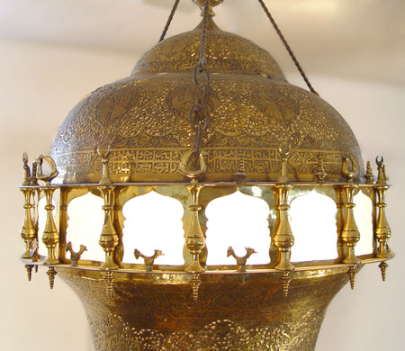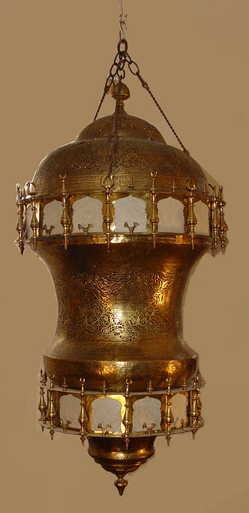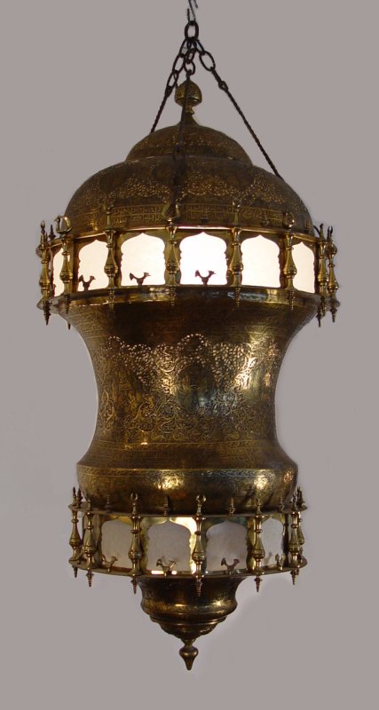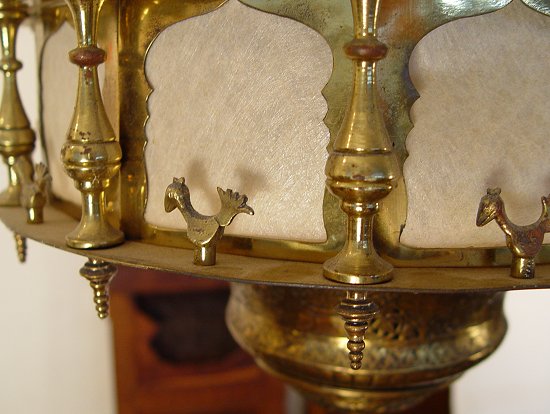 OVERSIZED OTTOMAN BRASS HANGING MOSQUE LAMP: Parchment? inserts backing figural bird, crescent and baluster trim, missing a few birds. Electrified but retains insert at very bottom for candles. Approx. 43''h.