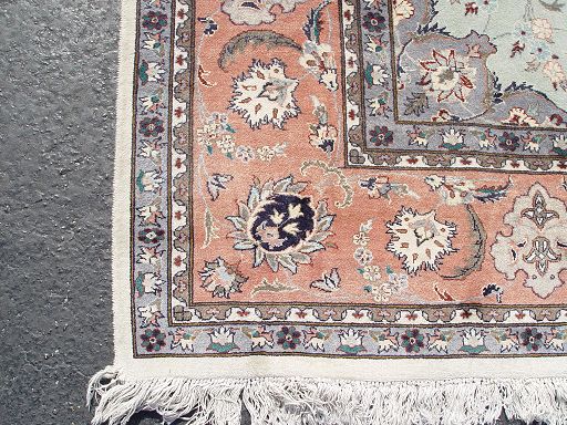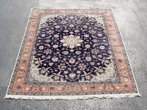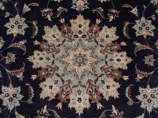 FINE HAND TIED ORIENTAL CARPET: Center medallion on dark blue field, approx. 9' X 12'