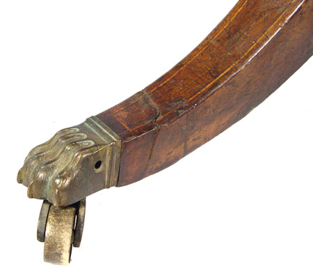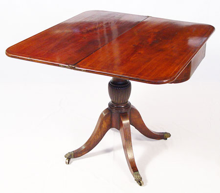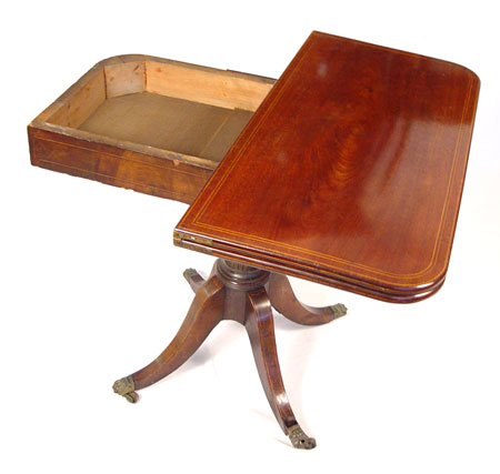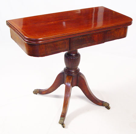 19th C STRING INLAY MAHOGANY GAME TABLE: Reeded urn pedestal, Brass paw feet caps and castors. 29''h., closed 17'' x 34'', open 34'' x 34''. Please note some chipping to the veneer edges and missing inlay.