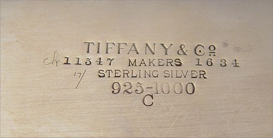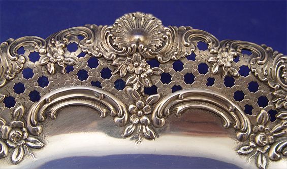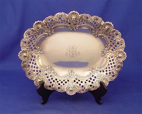 ORNATE TIFFANY & CO STERLING RETICULATED BASKET: ''Tiffany & Co 11547 Makers 1634 Sterling Silver 925-1000 C ''. Decorated with a shell, scrolls and flower design. Monogrammed. 1 1/4''h. x 11'' x 9''. Approx. 17.71 tray oz.