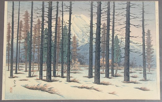 TAKASHI, Ito, (Japanese, 1894-1983): Snowy Forest Landscape with Mt Fuji in the distance, Woodblock, 9 1/2'' x 14 3/4'', float mounted in silver gilt frame, 13 1/2'' x 17 3/4''.