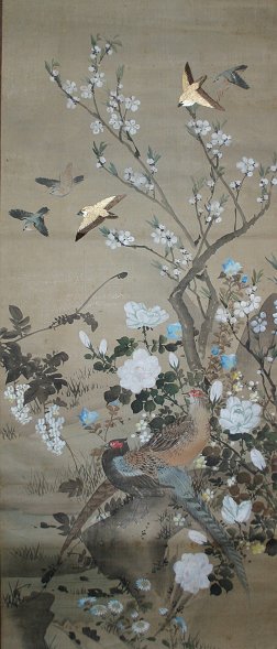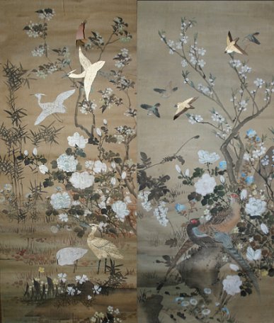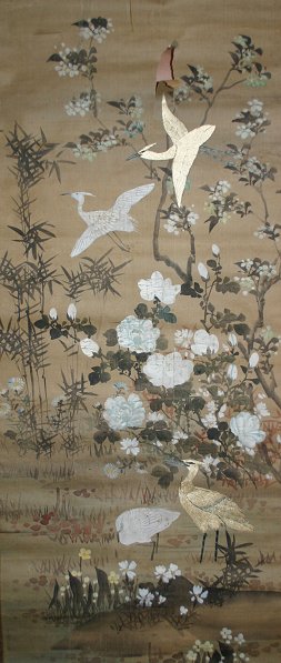 PAIR 19th C. JAPANESE PAINTED & EMBROIDERED SCROLLS: Approximately 46'' x 17 1/2'' image size, bone weight and hanging apparatus are detached, one scroll is in fair condition, the other has several tears, sold as is.