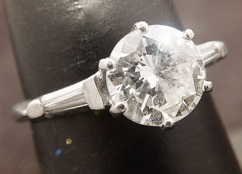 PLATINUM 1.38 CT. ROUND BRILLIANT SOLITAIRE RING: Platinum engagement ring with an approx. 1.38 Ct. round brilliant cut diamond. Rated SI1 in clarity and K in color. Centered by 2 tapered baguette cut diamonds, Total weight: .12 Ct. approx., rated VS in clarity and G-H in color. The diamonds are prong set. Weight: 4.7 grams. Size 5.5