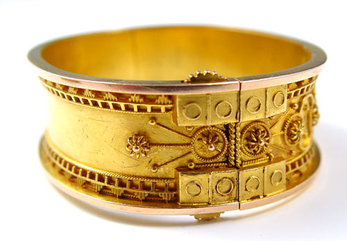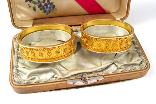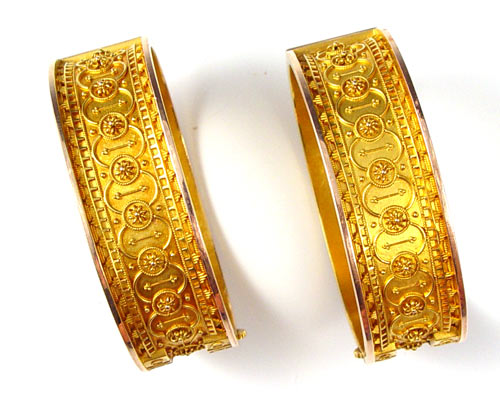 MATCHED PR VICTORIAN 14K GOLD CUFF BRACELETS IN ORIGINAL BOX: Classic Etruscan gold bead decoration of the period. Original presentation box from Giles Bros. & Co. Assayed 14K. 3/4'' wide. Interior wrist opening is 2.25''. Approx. 56.4 grams
