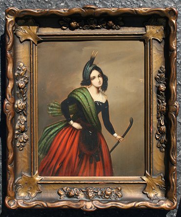 PAINTING OF A MAIDEN ON TIN: 10'' x 8'', probably 19th C., unsigned, gilded gesso frame, 13 1/2'' x 12''. Several minor abrasions.