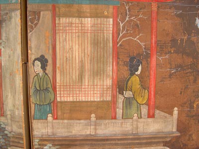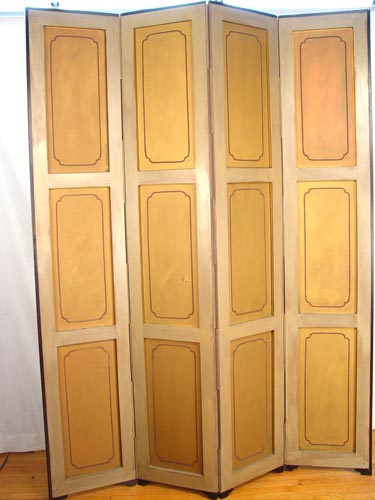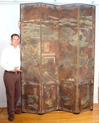 8 FEET TALL HAND PAINTED 4 PANEL CHINESE SCREEN: Continuing scene on 4 canvas panels on the upper portion. Individual still life scenes across the bottom. 8'1'' high. , 18'' wide panels.