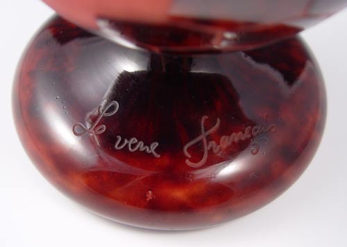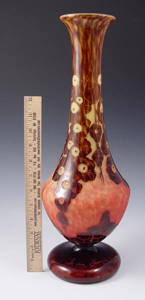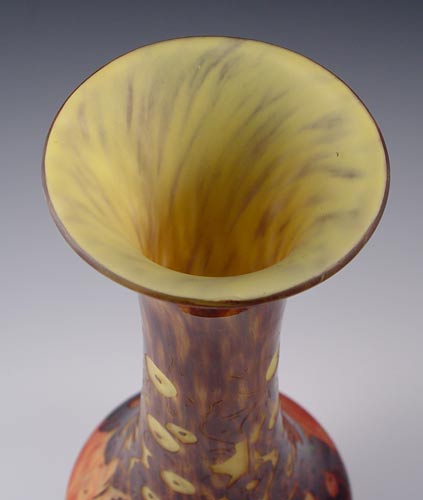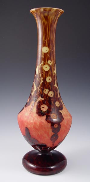 CHARLES SCHNEIDER LE VERRE FRANCAIS FRENCH ART DECO CAMEO GLASS VASE: Tortoise shell glass cut to mottled in a floral design. Engraved ''Le Verre Francais'' . 17''h.