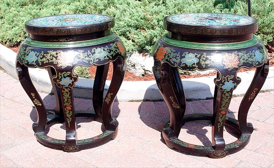 PAIR CHINESE CLOISONNE AND BLACK LACQUER TABLES / STANDS: Paint decorated, each with a unique recessed cloisonne top. 20 3/4''high x 15'' dia at top.