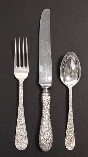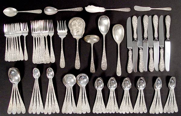 STIEFF ROSE STERLING FLATWARE SET FOR 8: 77 pieces to include 8 dinner knives (9 7/8''), 8 dinner forks (6 3/4''), 8 salad forks (6''), 8 iced tea spoons (7 1/2''), 8 soup spoons (6 1/2), 8 fruit spoons (6''), 16 teaspoons (6''), 4 serving spoons (7 7/8''), 2 casserole spoons (8 1/2''), 1 berry spoon (8 1/4''), 1 meat fork (7 1/2''), 1 master butter knife (7 1/8''), 1 jelly server (6''), 1 sugar (6 1/4'', 1 flat butter knife (6''), 1 gravy ladle (6 1/4''). Approx. 102.4 troy oz.