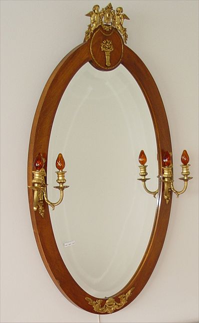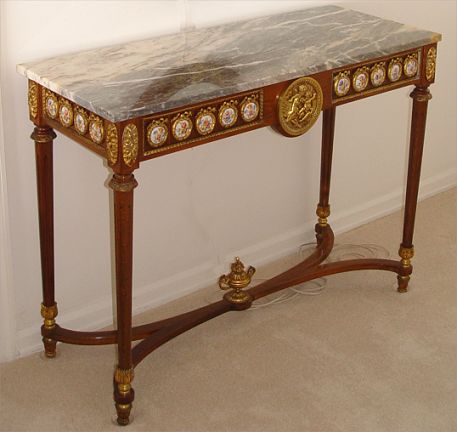 MARBLE TOP FOYER TABLE & OVAL MIRROR: Ormolu and porcelain mount table with gray marble top. The mirror is crested with gilt metal angels, electric sconce lights at the sides. Table measures 31 3/4'' high x 42 1/4'' wide x 17'' deep. Mirror measures 43'' x 27''