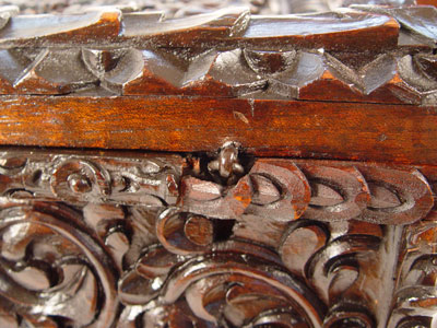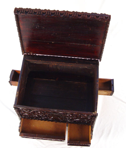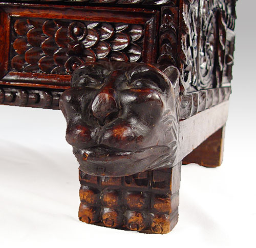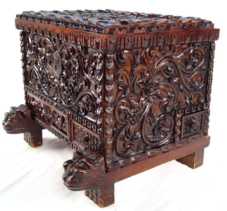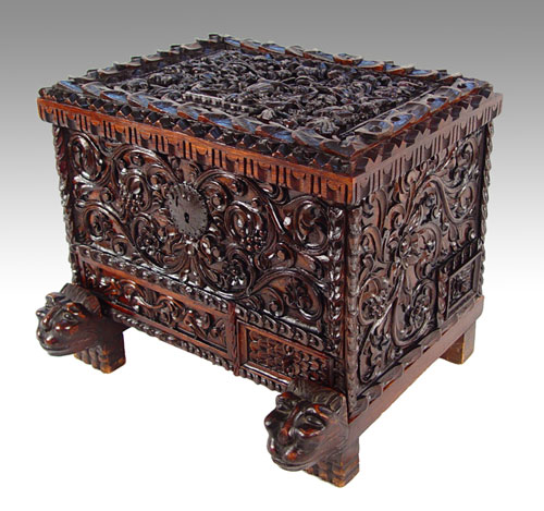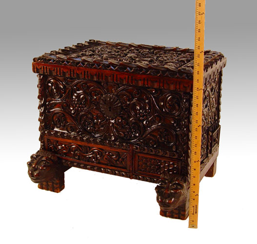 SPANISH PROFUSELY CARVED DOWRY CHEST: Hinged top with a series of 4 drawers around the bottom, figural feet protrude from the base. 20 1/4'' high x 23 1/4'' wide x 22'' deep