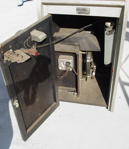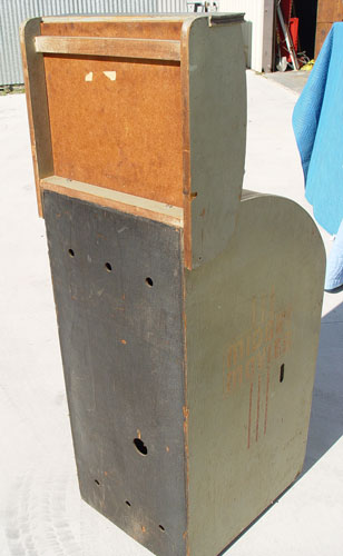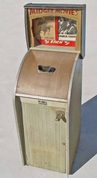 5 CENT MIDGET MOVIES COIN OP MACHINE: Circa 1940's Capitol Projector Corp. Midget Movies machine. Model MM-1 serial number 4601. Placards in top for Gene Autry ''Indian Uprising'' and Charlie Chaplin. Movies inside machine, not sure if they are the same as placards. Unsure of working condition, no plug. Measures 58 3/4'' high x 20 1/4'' wide x 24 1/2'' deep.