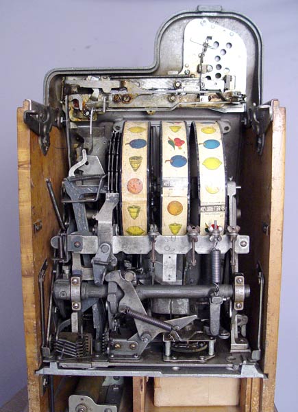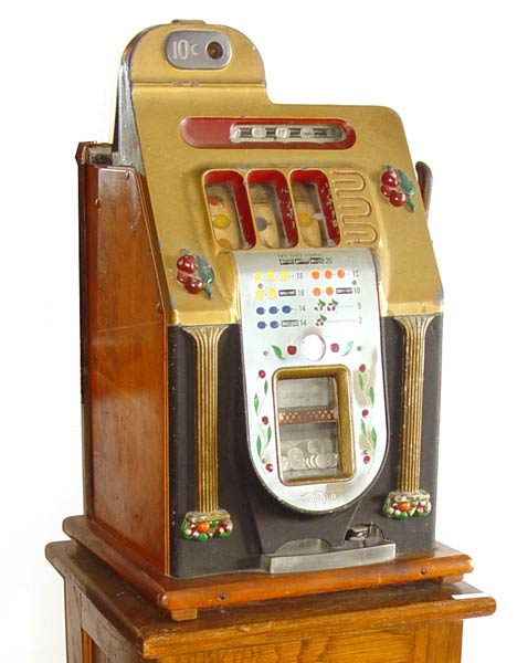 VINTAGE MILLS BLACK CHERRY 10 CENT SLOT MACHINE: Circa 1940's-1950's Mills Novelty Company Black Cherry slot machine. Appears to be in complete working condition. Please note paint flake on front. Comes with key. Measures 26 1/4'' high x 16'' wide x 15'' deep. Buyers and sellers in the following states may not participate in antique slot machine sales due to laws prohibiting slot machine ownership in their state: Alabama, Connecticut, Hawaii, Indiana, Nebraska, South Carolina, and Tennessee.