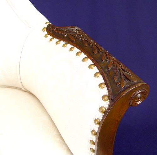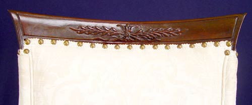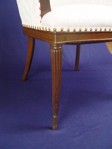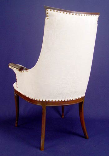 PAIR OF MAHOGANY PARLOR CHAIRS: High back, curved arm chairs with reeded and tapered legs. Recently upholstered. Measures 42'' high x 28 1/2'' wide x 24'' deep
