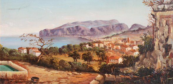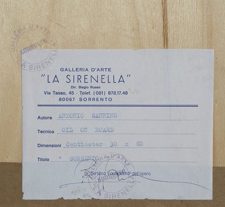 SANNINO, Antonio, (Italian, 20th C.): ''Sorrento'', OIL/B, 11 1/2'' x 23 1/2'', signed, framed, 13 1/2'' x 25 1/2'', La Sirenella gallery label verso.