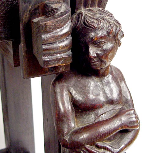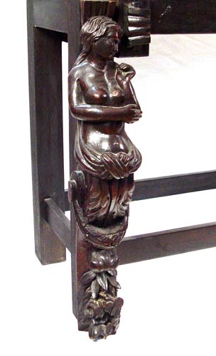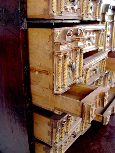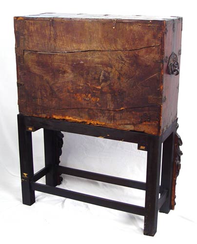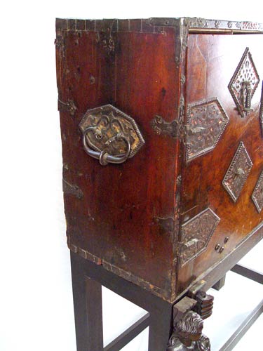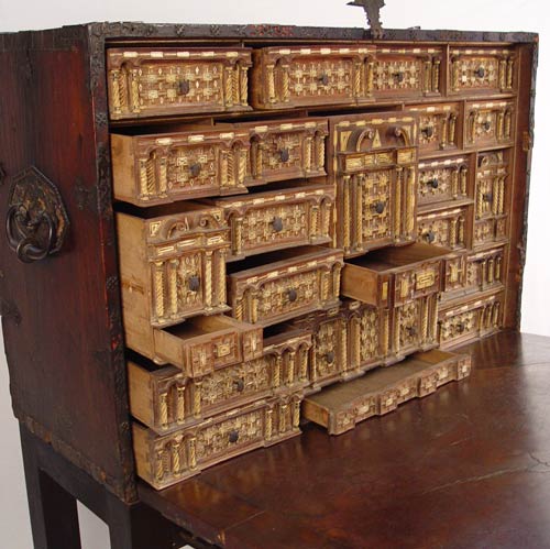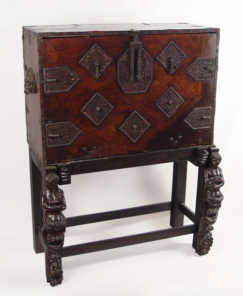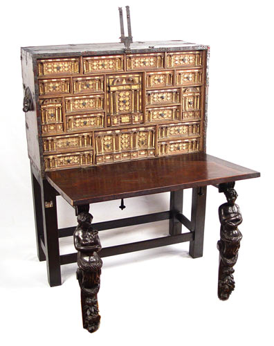 SPANISH VARGUENO DESK ON STAND: Interior drawers with spiral carved and inlay ivory and bone. Original iron clasps and key. Later base and figural carved supports. 58 1/4'' high x 44'' wide x 23 1/2'' deep