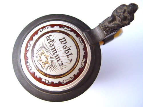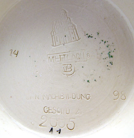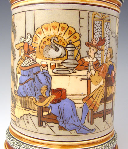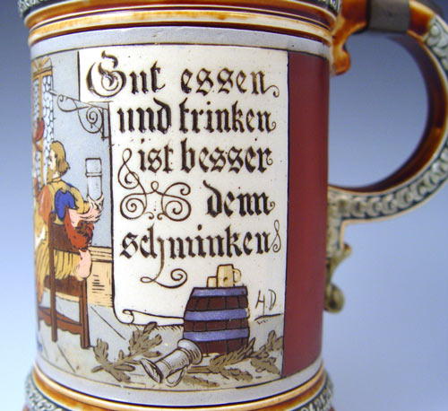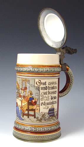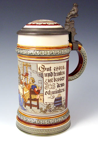 .5 LITER METTLACH STEIN 2005 CA. 1898: Figural pewter thumbpress with etched body scene of dinner with toasting phrase. Incised abby mark and #2005. Measures 8 1/2'' to top of thumbpress.